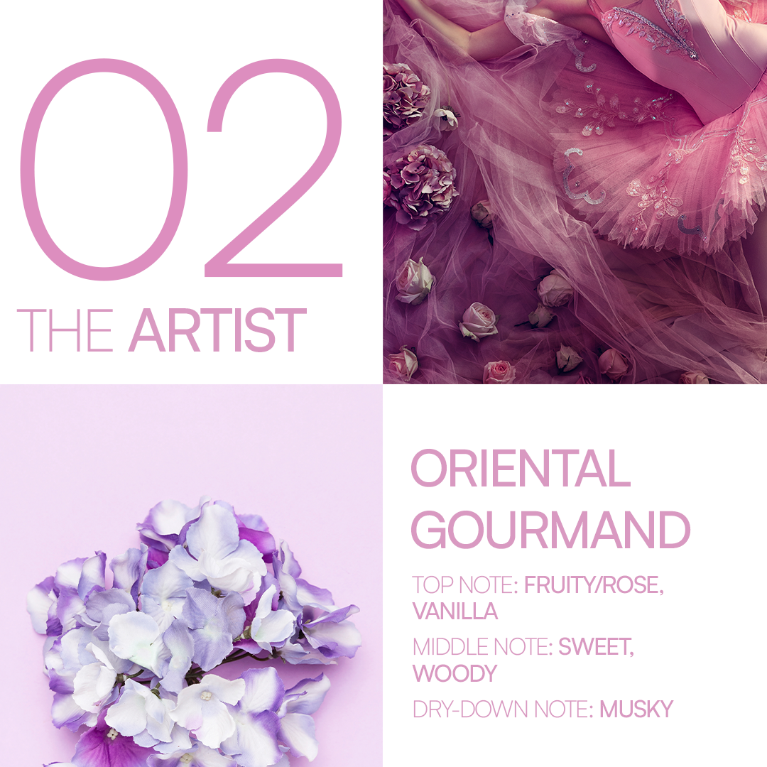 An expression of creativity and passion, The Artist captivates with its fruity rose and creamy vanilla opening, offering a blend of sweetness and allure. The heart reveals a delicate balance of sweet and woody notes, painting an aromatic masterpiece. The dry-down is a warm, musky finish, leaving a soft, memorable trace. This fragrance is perfect for those who embrace individuality and artistry.
