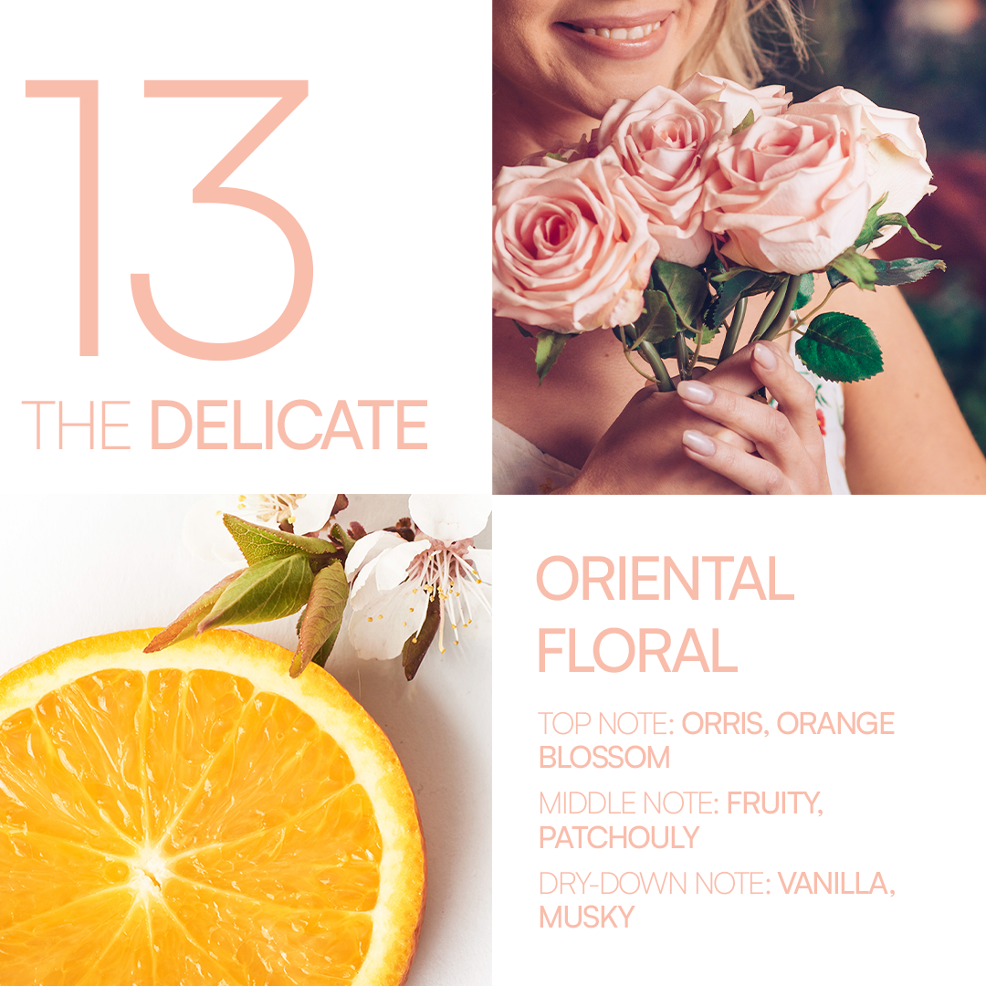 Soft and feminine, The Delicate opens with orris and orange blossom, creating a gentle floral beginning. Fruity notes and patchouli in the heart add a hint of sweetness, while the vanilla and musk base leave a soft, enchanting finish. Ideal for those who embrace elegance with a gentle touch.