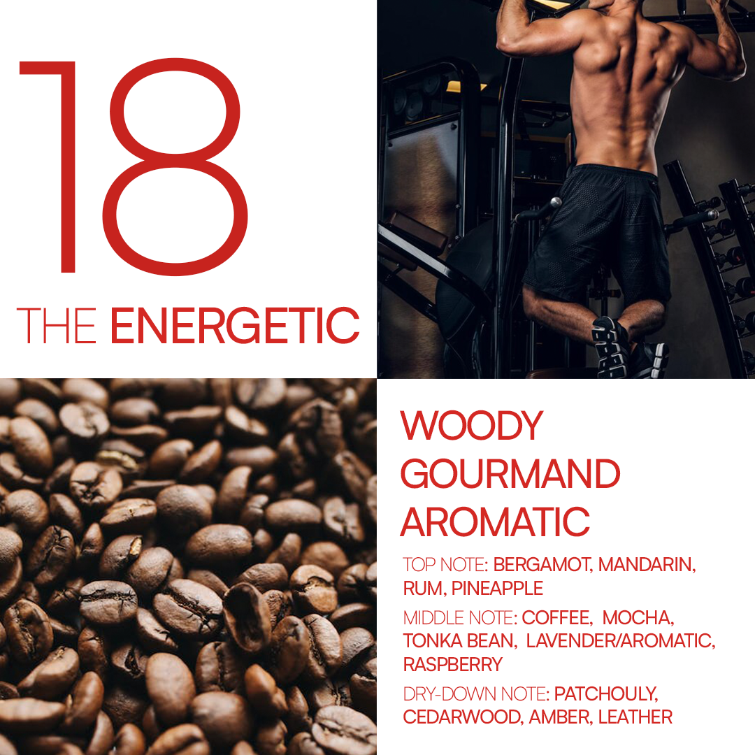 Bold and vibrant, The Energetic ignites the senses with its lively blend of bergamot, mandarin, and a touch of rum and pineapple. In the heart, a fusion of coffee, mocha, and tonka bean intermingles with lavender and raspberry, creating a burst of energy. The dry-down is deep and lasting, with notes of patchouli, cedarwood, and leather, leaving a daring, spirited impression. Perfect for those who live life to the fullest.