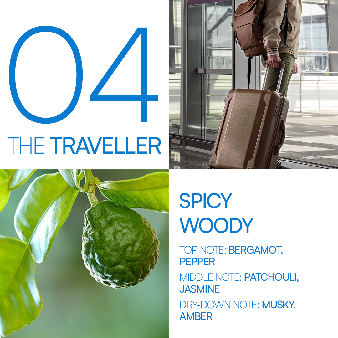An ode to adventure, The Traveler starts with zesty bergamot and a dash of pepper, igniting curiosity. The heart combines exotic patchouli and delicate jasmine, creating a balanced floral-woody experience. The musky amber dry-down leaves a lasting impression, perfect for those with a passion for exploration.
